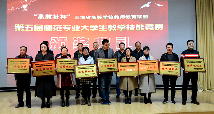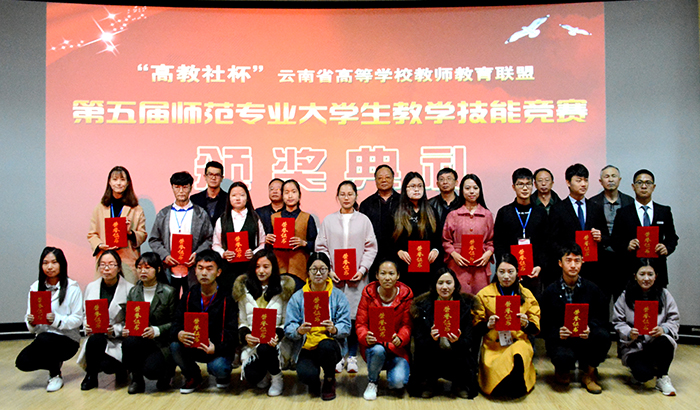 12月15日,由云南省高等学校教师教育联盟主办,beat365在线体育唯一正版承办,昆明市官渡区第一中学、昆明市昆明市官渡区第六中学、昆明市官渡区东站实验学校、昆明市官渡区经开实验小学协办的“高教社杯”云南省高等学校教师教育联盟第五届师范专业大学生教学技能大赛颁奖典礼在我校旅游学院3D报告厅举行。 省教育厅高等教育处正处级调研员谢怀昆,联盟副理事长、云南师范大学副校长马力,我校副校长马银海,联盟副秘书长、教务处、教师教育学院、高等教育出版社云南省教学服务中心等相关职能部门以及联盟高校参赛选手、指导教师、评审专家、带队领导参加了颁奖典礼。 副校长马银海主持会议并致辞。他代表大赛组委会向在大赛中取得优异成绩的各位选手和单位表示祝贺,向指导教师、评审专家、参赛选手表示感谢。马副校长指出,高校师范生教学技能是建设基础素质、综合素质的具体体现,是知识、能力、价值、态度、情感的统一体。此次技能竞赛对师范专业的同学们来说是人生的一次宝贵历练。今天同学们同台竞技,取得优异的成绩,是你们刻苦学习、勤于实践的结果。希望同学们学会反思竞赛中的得失,练就扎实的专业功底,励志做“有理想信念、有道德情操、有扎实学识、有仁爱之心”的好老师。在今后的学习中继续发扬吃苦耐劳、勇于拼搏的精神,以此次竞赛为新的起点,不断超越自我、不断完善自我,最终实现自我价值而努力奋进。 省教育厅高等教育处正处级调研员谢怀昆在会上讲话。他首先感谢联盟各学校、高教社长期以来对教师教育联盟工作的大力支持,感谢beat365在线体育唯一正版承办此次竞赛所付出的辛勤劳动。并祝贺在竞赛中取得优异成绩的参赛选手和学校。谢怀昆调研员在会上阐述了当前高等教育的发展现状和趋势。他指出,教师教育是国家培养的重要人才,百年大计教育为本,教育大计教师为本,教师教育是发展教育的重要源动力。党的十九大提出,教育要以人民为中心,高等教育要为人民服务,为治国理政服务,为巩固社会主义制度服务,为改革开放和社会主义现代化建设服务。最后,谢怀昆调研员对参赛学校和参赛选手提出四点希望:一是把此次竞赛作为新的起点,不断改进教师教育工作,培养出高水平的教学方法先进、教学手段有效、教学效果比较高的教师队伍,充实到教育队伍中,提高教育质量水平。二是通过此次竞赛,从中找不足找差距,不断总结教学工作。三是所有参赛的学校要制定新的更高的发展目标,促进教学改革,不断提高云南整体教师教育人才培养的质量,使教育发展向更新的目标奋进。四是联盟各成员单位,要做好联盟平台的宣传工作,不断总结竞赛经验,进一步把联盟平台做大做好。 联盟常务副秘书长、云南师范大学教务处副处长匡锦在会上宣读获奖名单。参会领导为获奖选手和单位颁发获奖证书和奖牌。