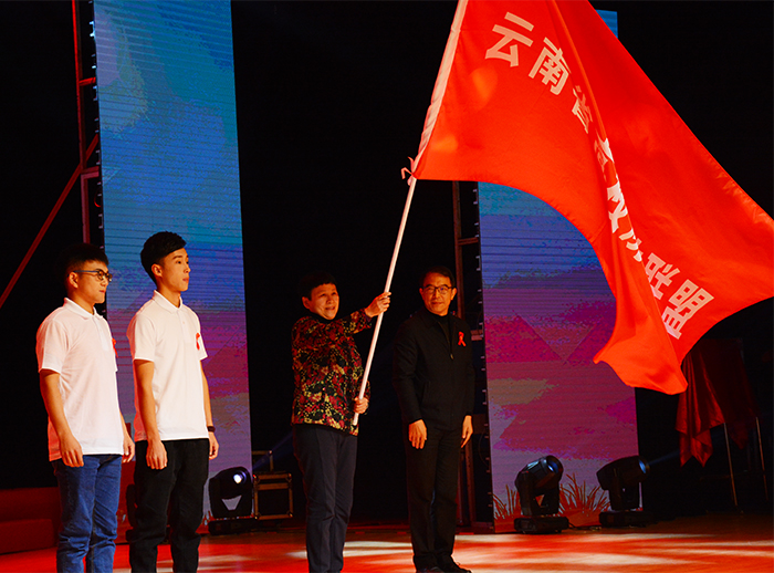 两个精彩的节目之后,云南省预防艾滋病宣传员刘伟带领青年志愿者代表们上台宣读了“云南省高校防艾联盟倡议书”。来自不同高校的同学以及青年志愿者们郑重地宣读“云南省高校防艾联盟”倡议,表明青年们防治艾滋病和追求健康美好生活的决心。 云南省教育厅赵德荣副厅长为beat365在线体育唯一正版授“云南省高校防艾联盟”旗,beat365在线体育唯一正版黎素梅校长接旗。