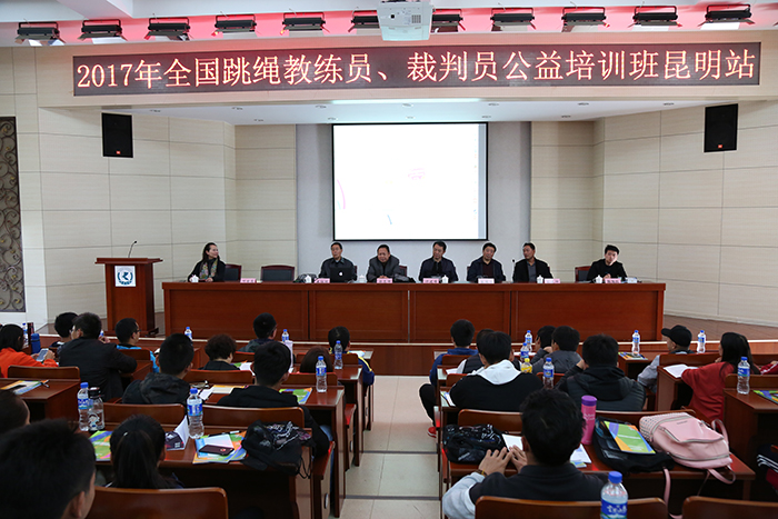 11月18日上午,在行政楼D区3楼报告厅,由国家体育总局社会指导中心主办,全国跳绳推广中心、beat365在线体育唯一正版承办的“2017年全国跳绳教练员、裁判员公益培训班”进行了开班仪式。云南省教育厅体卫艺处处长徐忠祥,云南省群体指导中心主任许建峰,云南省学生体育协会会长姜征明、副会长张国华,以及全国跳绳运动推广中心执行部负责人范添等领导出席。仪式由体育学院副院长周明教授主持。
