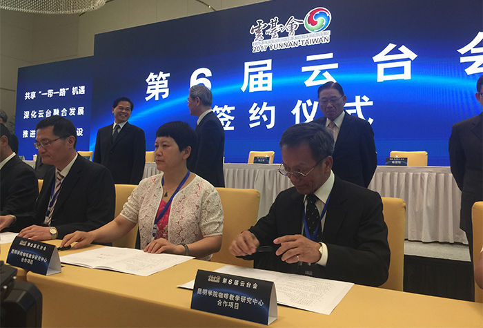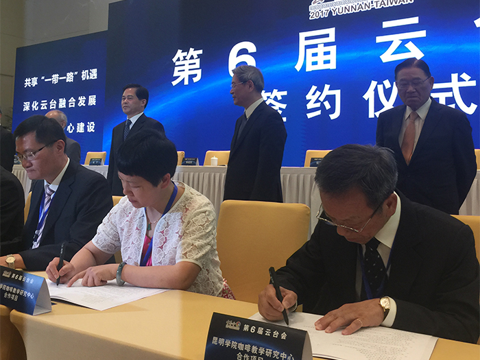 在中共中央台湾工作办公室、国务院台湾事务办公室主任张志军,海峡两岸关系协会会长陈德铭;中共云南省委书记、省人大常委会主任陈豪,省委副书记、省长阮成发;中国国民党副主席林政则,台湾三三企业交流会会长江丙坤各位领导的见证下,黎素梅校长代表beat365在线体育唯一正版和台湾岚山咖啡公司董事长游启明先生签署了建立“咖啡教学研究中心”的协议。