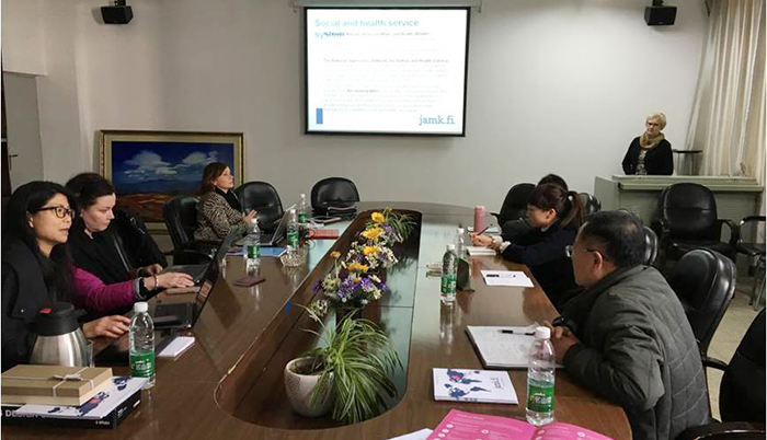 日前,第一阶段活动已经启动。由芬兰JAMK应用科技大学派送3位老年护理及康复专家到我校医学院进行为期5天的交流培训。3位专家已经于1月11日到达昆明。按照双方商定的第一阶段活动内容,在5天的时间里,芬兰专家将与医学院护理、康复治疗技术专任教师开展关于两国老龄化、老年医学、护理发展现状及教育模式的交流,并对我校附属医院、昆明市的相关老年病医院以及老年公寓进行了考察。