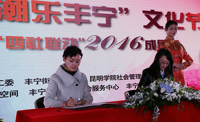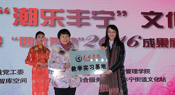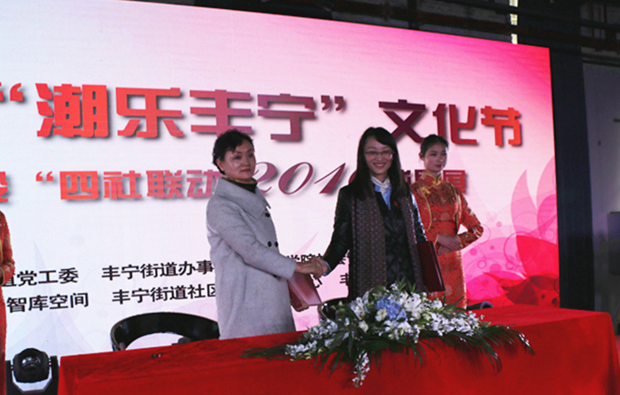 为更好总结试点工作经验,提升社区工作服务水平,不断发挥辖区文化资源优势,着力打造文化品牌,开展文化惠民、文化乐民活动,丰宁街道党工委、办事处联合beat365在线体育唯一正版社会管理学院于2016年12月21日在108智库空间美术馆举办了“第三届‘潮乐丰宁’文化节暨社区建设‘四社联动’2016成果展”。校长黎素梅出席活动,并为“beat365在线体育唯一正版教学实习基地”揭牌,副校长董建华、副校长马银海及校办主任杨斌、教务处处长解永刚、社会管理学院党政领导一行参加本次活动。