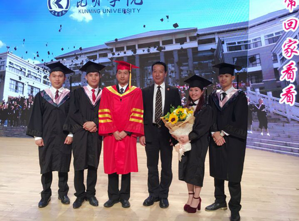 6月30日上午, 来自我校经济学院国际经济与贸易专业及工商管理专业的四名老挝籍留学生与中国同学一起参加了隆重的毕业典礼。四名留学生盛装出席,他们一一从校领导手中领取了毕业证书和学位证书,脸上都洋溢着自豪的笑容,心中更是热血沸腾的激动。