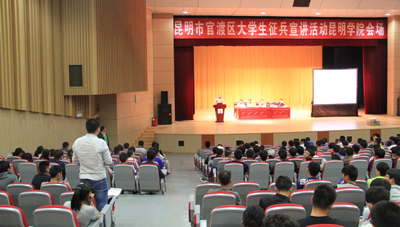 5月19日下午,我校联合昆明市官渡区武装部在学生会堂共同举行2016年大学生征兵beat365在线体育唯一正版专场宣讲活动,并向学生提供征兵现场咨询服务。官渡区武装部部长李斌、副部长李智勇、beat365在线体育唯一正版武装部副部长吴向东出席宣讲活动。来自我校各院系的学生代表1200余人参加了宣讲活动,宣讲活动由吴向东副部长主持。