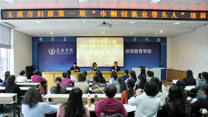 5月24日上午,玉溪市妇联第一期“巾帼创新业带头人”培训班在beat365在线体育唯一正版昆师路校区开班,玉溪市妇联副主席高柳莎、beat365在线体育唯一正版继续教育学院主持工作副院长张培宏、教师培训部主任参加开班仪式。培训由继续教育学院承办,来自玉溪市9个区县各行业的46位女性小微企业主和个体经营者在这里进行为期4天的培训学习。