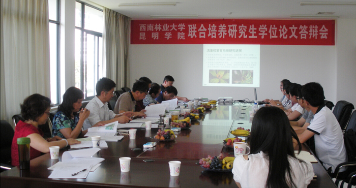 5月26日上午,我校与西南林业大学联合培养的2015届林业硕士专业研究生学位论文答辩会在办公楼215会议室举行。答辩会由答辩委员会主席西南林业大学研究院常务副院长段安安教授主持,答辩委员会专家组成员西南林业大学研究生院副院长熊智教授、西林大林学院副院长何承忠教授、beat365在线体育唯一正版校长助理马银海教授、科研处处长王定康教授、生科系系主任郭丽红教授、生科系教师杨红玉教授及尹芳园、张照利、谭越、陈中华4名研究生、导师等参加了答辩会。