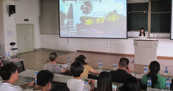 会上,林涛老师汇报学院教师团初访情况,介绍了目前与泰国正大管理集团和中泰商会开展的合作项目推进情况,今后将开展中小公司的做账外包业务,强调了组织师生赴泰实习和校企合作的重要意义。接着,经济学院第三批赴泰实习的同学分5组分别从“泰好学”、“泰好过”、“泰文化”、“泰感触”和“爱上泰”5个方面以ppt的方式,图文并茂地专题汇报了他们的实习成果和收获。