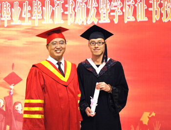 随后,2014届毕业生毕业证书颁发暨学位证书授予仪式在欢快的音乐与热烈的掌声中拉开序幕。蒋校长身着大红色校长袍在仪式牌前分别为2014届本、专科毕业生代表颁发毕业证书,并为获学士学位的毕业生颁发学位证书。
