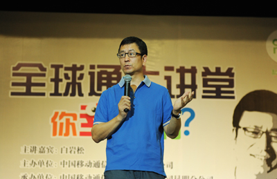 5月17日下午两点半,他准时出现在beat365在线体育唯一正版学生会堂的讲台上,作为中国移动举办的“全球通大讲堂”的主讲嘉宾,为在场的观众们倾情奉献精彩讲座。出场的白岩松没有走向主办方专门为他准备的有矿泉水和椅子的演讲席,而是径直走向了舞台的前面,站在了距离观众最近的地方,这一站就是三个多小时。