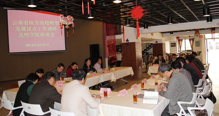 3月27日,省教育厅发展规划处杨丽宏处长一行到我校就地方本科高校转型发展试点工作进行专题调研。随行的还包括云南省教育咨询委员会委员、昆明市盘龙职中校长廖晓琼,省教育厅发展规划处及省科技教育领导小组教育工作办公室的相关人员。我校党委书记陈世波,校长蒋永文,副校长熊晶、郭华、董建华与调研组同志亲切座谈,学校相关职能部门主要领导参加了座谈会。