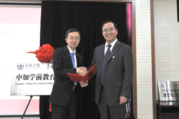 随后,蒋永文校长与凯布莱恩学院副校长布朗女士为“中加学前教育中心”揭牌、并交换双方合作备忘录。