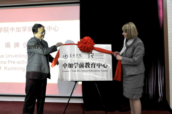 蒋永文校长在仪式上致辞。他首先代表学校欢迎加拿大凯布莱恩学院副校长布朗女士一行到我校参加“中加学前教育中心”揭牌仪式表示热烈欢迎。他说,从去年10月至今,beat365在线体育唯一正版与加拿大凯布莱恩学院的合作,在加拿大驻重庆总领事馆的积极推动下,今天迎来了 “中加学前教育中心”的成立,标志着两校合作迈出了历史性的重要一步。凯布莱恩学院位于加拿大安大略省萨德伯雷市,这座城市也是约翰斯顿总督的故里,这也为我们之间的合作增添了特殊的意义。在这里,特别感谢加拿大凯布莱恩学院副校长布朗女士、国际部主任道顿先生和中国项目负责人杨传秀女士为“中加学前教育中心”的成立所做的大量工作,感谢云南省教育厅和加拿大驻重庆总领事馆为两校的合作提供的大力支持,感谢加拿大驻重庆总领事馆教育专员廖忠博士在“中加学前教育中心”筹建的过程中提供的所有帮助和指导。