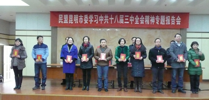 12月20日,民盟昆明市委在五华区政府四楼多功能厅召开中共十八届三中全会精神专题报告会,民盟beat365在线体育唯一正版总支10名盟员代表聆听了中共昆明市委宣讲团成员、市委政策研究室龚志龙主任对十八届三中全会精神的解读。