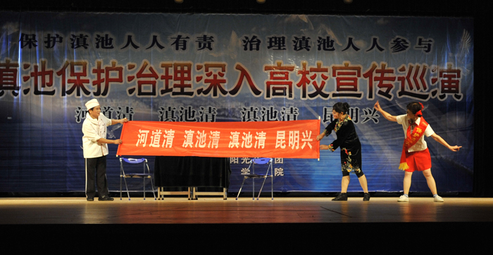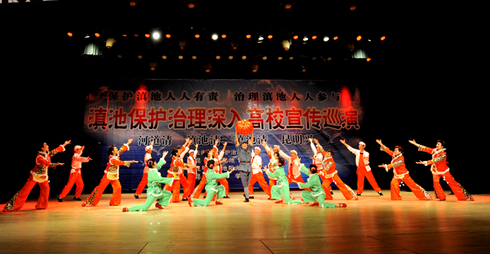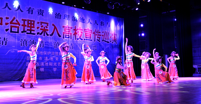 演出中,艺术团把滇池保护治理及生活中的环保知识穿插于每一个节目演出前的介绍中,通过小品与师生的互动,让师生进一步增强保护滇池人人有责,治理滇池人人参与的意识,用自己的一言一行,宣传和感染身边的人们,以实际行动,积极投入到滇池的保护与治理工作中,为我们美丽的母亲湖、为美丽的昆明做出应有的一份贡献。