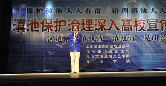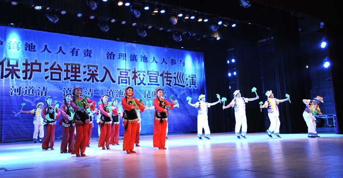 为在广大师生中宣传滇池环保理念,进一步提高师生环保意识, 11月15日晚,由昆明市部分离退休老同志组成的昆明滇池阳光艺术团在我校学生会堂上演“滇池保护治理”为主题的文艺演出。我校副校长熊晶,昆明滇池(湖泊)污染防治合作研究中心主任钱春萍,农学院党总支书记王德斌、院长黄鹤平,旅游学院党总支书记张士芬、副书记杨光明、副院长吴跃辉,音乐学院院长靳丽芬及部分学生代表观看了演出。
