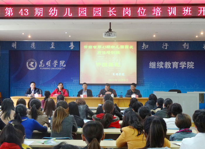 10月9日,云南省第43期幼儿园园长岗位培训班在我校继续教育学院正式开班,昆明市教育局副局长李瑞林、师训处处长王建方,我校继续教育学院院长陈嘉、副院长张培宏出席开班典礼并讲话。本期培训班共有来自全省的73名幼儿园园长参加,集中培训时间为3个月。