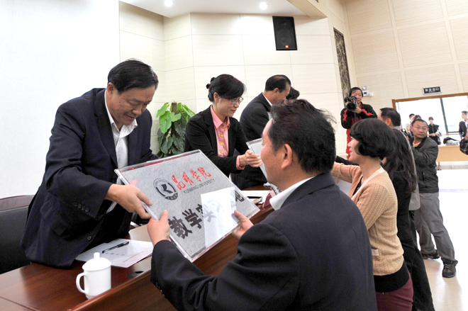 随后举行了授牌仪式。由参会领导向昆明市盲哑学校、盘龙区培智学校、五华区新萌学校授予beat365在线体育唯一正版特殊教育专业教学实习基地的牌子,今后这四所学校将成为beat365在线体育唯一正版特殊教育专业的首批实习见习基地。