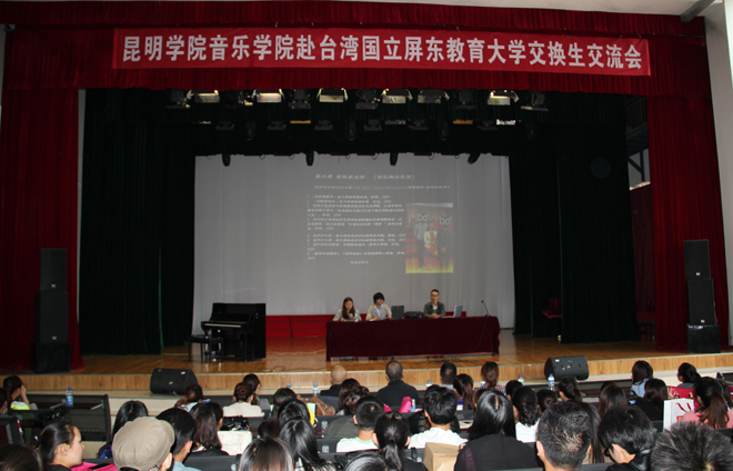 交流会上,音乐学院2010级音乐学1班赴台湾国立屏东教育大学做交换生的蓝楠、汤博文、吴飞龙三位同学分别进行交流,与到会师生分享了在台湾学习、生活四个月的经历和收获,介绍了台湾国立屏东教育大学的教学特点及两地教学的差异,现场展示了自己的学习成果。