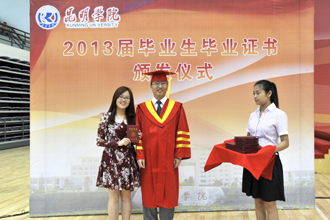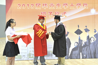 随后,在欢快的音乐与热烈的掌声中,蒋永文校长分别为2013届本、专科毕业生代表颁发毕业证书,并为获学士学位的毕业生拨流苏授学位、颁发学位证书。蒋校长身着大红色校长袍站立,毕业生身着学位袍、头顶四方帽一一向校长鞠躬,从校长手中领过学位证书,并与校长合影留念,定格下在校最后一刻美好回忆。当同学四方帽上的流苏被校长亲手从右拨到左边的那一刻起,莘莘学子就此挥别青青校园,踏上人生新旅程。