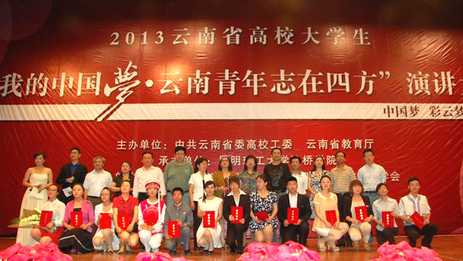 5月17日,2013云南省高校“我的中国梦•云南青年志在四方”演讲大赛在昆明理工大学津桥学院举行。我校社会管理学院的觉晓雨同学和经济学院的董志超同学代表学校参加了比赛,两名同学凭借自己不俗的实力和场上良好的发挥,最终觉晓雨同学一路过关闯进决赛,用自己激情洋溢的演讲——《智者走在田野》夺得比赛的桂冠,荣获特等奖,董志超同学荣获优秀奖。省委高校工委副书记陶晴出席颁奖仪式并为获奖选手颁奖。
