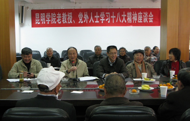 座谈会由党总支何华书记主持,他说,党的十八大于11月8日胜利召开,老教授及民主党派、党外人士集体收看了开幕式实况,又参加了昆明市委组织的三次党的十八大精神的宣讲。老同志们有着良好的政治素养和学习习惯,对党的十八大报告一定理解较深,今天请大家来就是相互交流学习的心得体会。老党员、老教授协会会长柴毅龙就“五位一体”全面建成小康生活做了主题发言,老党员李建民就首次将“科学发展观”确立为党必须长期坚持的指导思想做了主题发言。侨台联合会主席郭卫舵就党的十八大对统一战线的论述作了的主题发言,民盟代表刘敬业就生态文明建设做了主题发言。何俊副处长谈了自己学习的心得,表示要结合党的十八大的学习,认真贯彻党中央提出的“八项制度”,在老干工作中做到“常怀儿女之情,恪守敬老之责,善谋为老之策,多办利老之事”,更好地为广大离退休同志服务好。最后,统战部沈部长在发言中说,在听取了老教授们的学习体会之后很受感动,所谈的体会和理解有一定高度,也有广度和针对性,今后统战部将加强对离退休统战工作的指导,做到统战工作的全覆盖。离退休老教授及党外人士代表共计50余人参加了座谈会。