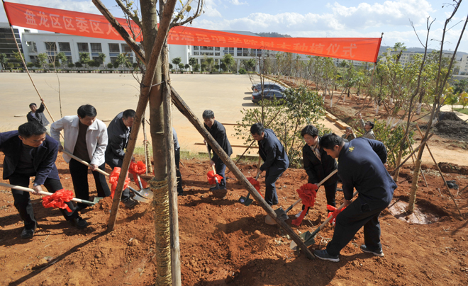 11月27日上午,我校副校长熊晶、董建华与到访的盘龙区委副书记、区统战部部长汪宏昌,盘龙区委办公室副主任、区群众工作局局长李江,盘龙区园林绿化局党组书记吴国海,盘龙区国投集团董事长陈志伟,盘龙区国资公司副总经理刘正良等领导,在我校观物山上为盘龙区捐赠我校树木移载培土浇水。