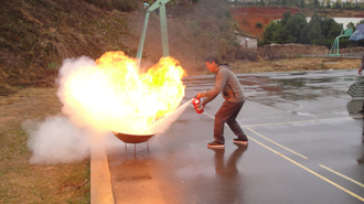 在接力火盆灭火比赛项目中,运动员手提3公斤的干粉灭火器,箭步如飞,你追我赶,灭火器在奔跑中顺序传递,一盆盆熊熊烈火在师生们熟练的“一拔、一提、一压”的动作要领下瞬间被扑灭,动作连贯,一气呵成。