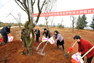 我校党委书记陈世波,党委副书记孙勇,副校长熊晶、董建华与禄劝县委书记段俐娟,县长李开德,副县长付兆雯,县林业局副局长曲耀鸿等领导共同为移载树木培土浇水。
