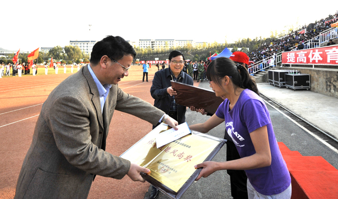熊晶副校长致闭幕词。熊副校长代表学校党委和行政向在运动会上取得优异成绩的个人和集体表示热烈祝贺,向为本次运动会付出辛勤劳动的各位老师和同学表示感谢和问候。熊副校长指出,本次运动会是我校又一次成功举办的体育盛会,是对我校体育工作和师生综合素质的检阅,它充分反映了我校体育事业蓬勃发展、体育教学水平不断提高的良好态势。整个赛会准备充分、组织有序、进展顺利。本次运动会上运动健儿们表现出的顽强拼搏,勇攀高峰、催人奋进的精神将对全校各项建设事业起到积极的促进作用。熊副校长希望全校师生员工要在今后的工作中继续保持和发扬运动会上表现出的不怕困难、敢于拼搏、团结协作、奋勇争先的精神,以更加饱满的热情、更加坚韧的意志投入到学校迎评促建和各项工作中去,为早日实现“十二五”发展目标而奋斗。