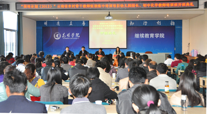11月2日,“国培计划(2012)”云南省农村骨干教师短期集中培训项目初中化学教师、幼儿园园长培训班在我校同时开班,来自全省的42名初中化学教师和81名幼儿园园长开始在我校继续教育学院进行15天的短期集中培训学习,这是我校承担的“国培计划(2012)”短期集中培训项目最后一批学员。我校继续教育学院、昆明市教育局相关领导出席了在昆师路校区举办的开班典礼。开班典礼由继续教育学院张培宏副院长主持。