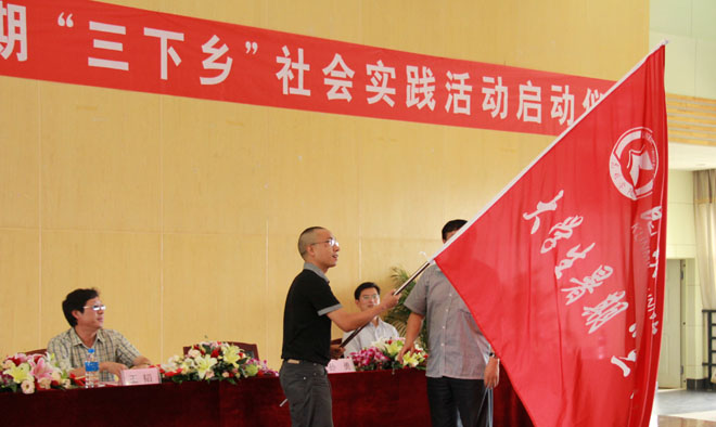最后,孙勇副书记发表了重要讲话。他对近年来团委组织的“三下乡”社会实践活动的效果和成绩给予了肯定,并对本次活动提出了三点希望:一是希望带队教师和同学们一定要牢牢树立“安全第一”的思想,始终把安全工作放在首位,确保实践活动顺利开展;二是希望大家把社会当作大课堂,虚心向当地群众学习,在实践中提高自身素质,促进全面发展;三是希望大家敢于吃苦,不怕困难,发扬“奉献、友爱、互助、进步”的志愿者精神,发扬我校的光荣传统和优良校风,自觉维护学校的声誉,以实际行动展现我校师生积极进取、健康向上的精神风貌。启动仪式在师生志愿者们热烈的掌声中圆满结束。