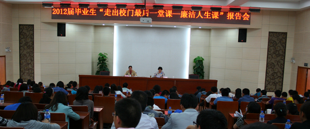 为教育2012届毕业生在走出校园之后,敬廉崇洁、诚信守法,牢固树立廉洁观念,努力践行廉洁行为。5月30日下午16时,校纪委办公室在D区报告厅组织开展了2012届毕业生“走出校门最后一堂课—廉洁人生课”专题报告会,报告会由学校党委副书记、纪委书记李媛芬同志主讲,18个教学院(系)的党总支书记、副书记、校纪委办全体同志及各院(系)毕业生党员代表等180余人参加,报告会由监察审计处处长陈开祥同志主持。