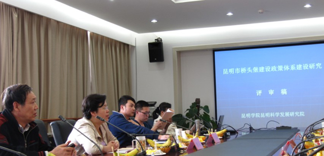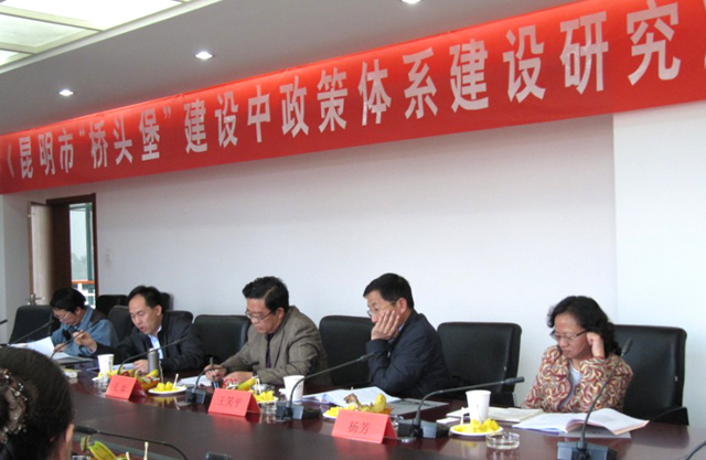 4月11日下午,由昆明市发改委委托beat365在线体育唯一正版研究课题《昆明市“桥头堡”建设中政策体系建设研究》专家评审会在我校举行。省政府研究室副主任孔灿,市委政研室主任袁培文,市政府研究室主任王笑平,市社科联主席杨芳,市政府副秘书长、昆明市金融办主任洪维智,昆明市发改委黄建玮处长,以及学校科研处负责人和课题组全体成员,参加了评审会。评审会由科发院黄继元教授主持。