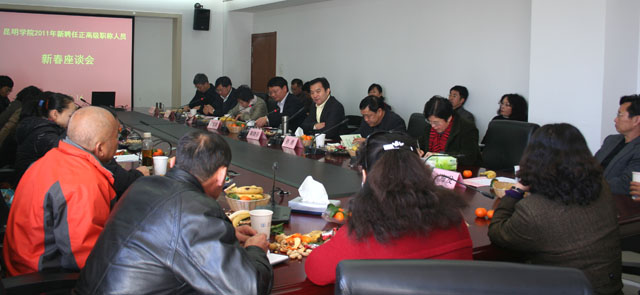 1月16日上午,我校召开了2011年新聘任正高职称人员新春座谈会。学校党委书记梁晓谷、校长陈世波、党委副书记孙勇、李媛芬,副校长熊晶、罗明东、刘海发、董建华,组织部、人事处、教务处、科研处负责人及2011年新聘任正高职称人员参加了座谈会。座谈会由罗明东副校长主持。