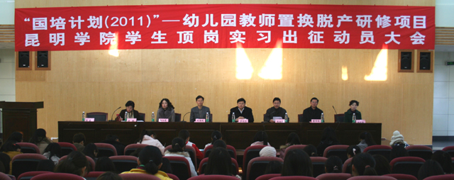 会上,职业技术教育中心主任熊绍宏老师着重介绍了“国培计划”实施的背景、任务、意义以及云南省近两年来实施国培计划的情况。教师教育学院主持工作的副院长唐敏教授则从专业知识和技能方面要求全体同学们做好各种准备。罗明东副校长在会上作了重要讲话,他要求每一位同学要牢记“国培计划”的使命,充分认识此项工作的重大意义,明确职责和任务,从思想、心理、专业知识和技能等方面做好充分准备。他希望同学们要利用参与此次“国培计划”的机会,深入基层、了解社会、拓宽视野、增长知识和才干。同学们要克服种种困难,在为当地学前教育事业科学发展做出贡献的基础上,展示我校大学生的风采,自觉维护学校的良好形象和声誉。2009级学前教育2班包敏同学代表全体同学发言,表达了完成此次顶岗置换实习任务的态度和决心。最后,刘海发副校长作了总结讲话,他要求职业技术教育中心、教师教育学院要协调好各方面的关系,学校也会创造一切条件为同学们解决后顾之忧,希望同学们安心并用心对待此项工作,不负国家的重托和学校的期望,圆满完成此次顶岗置换实习任务。刘副校长还就顶岗实习期间的安全问题作了具体要求,希望同学们要增强个人安全防范意识,杜绝任何安全事故的发生,职教中心和教师教育学院要主动全面跟踪每个实习点学生的情况,要为学生开设24小时开机的热线电话,为学生提供全天候服务。