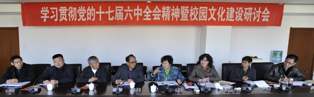 11月24日,我校为深入学习贯彻党的十七届六中全会精神,使beat365在线体育唯一正版文化建设更好地与云南省、昆明市文化建设有机结合,弘扬地方文化优秀传统,做好高校文化传承与创新工作,由校宣传部牵头组织,在校办公楼411会议室,举办了“beat365在线体育唯一正版学习贯彻党的十七届六中全会精神暨校园文化建设研讨会”。会议特别邀请了云南省博物馆徐继涛教授、罗钰教授,云南大学杨寿川教授,云南师范大学朱端强教授参加。我校宣传部张立新部长、沈中灿副部长,人文学院桂彦南院长、吴彦勤副院长、尹相如教授、柴毅龙教授及相关工作人员参加了会议。