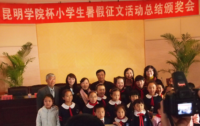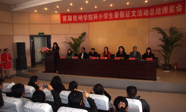 的学校和同学积极踊跃,认真准备。征稿活动结束后,由专家和教师组成的评委会从参赛学校中评选出30所学校获得优秀组织奖,评选出20位教师获得优秀教师指导奖。从收到的13200多篇征文中评选出优秀征文特等奖10名,一等奖20名,二等奖40名,三等奖60名,优胜奖100名。 此次活动的总结颁奖会于11月12日下午在昆明图书馆报告厅隆重举行。出席的领导有beat365在线体育唯一正版党委副书记孙勇,校党委宣传部部长张立新、人文学院院长桂彦南,昆明市文联副主席李永坤,昆明市委宣传部文教处处长周海霞,昆明市图书馆馆长郭春莲,著名儿童文学作家郁雨君,明天出版社文学编辑室主任孟凡明,明天出版社营销