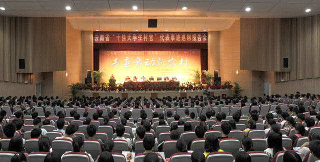 | 9月27日,由省委组织部、省委宣传部、省委高校工委、省教育厅、省人力资源和社会保障厅、共青团云南省委共同组织的云南省“十佳大学生村官”代表事迹巡回报告会第五场在我校学生会堂举行。学校党委副书记孙勇出席并主持报告会,省委组织部干部二处、省教育厅学生处相关领导,我校相关职能部门领导,教学院(系)党总支书记、分管就业工作的领导及负责就业工作的辅导员、大三及大四学生代表共计1400余人参加报告会。