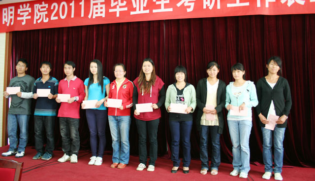 今年,我校的考研工作取得了优异的成绩,有59名同学笔试成绩上线,其中985类学校上线10名,211类学校上线21名,其他类学校上线28名,上线率在2010年的基础上提高了136%。