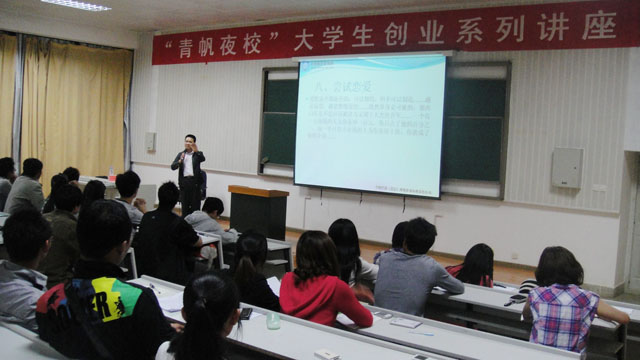 由校团委和招生就业处主办,学生社团联合会承办的beat365在线体育唯一正版第三期“青帆夜校”大学生创业系列讲座第三讲于5月12日晚,在惟实楼6102教室开讲。新前景教育培训机构董事长、中财仕通(北京)财税咨询有限责任公司首席运营官付仕伟老师为我校220余师生作了《我们创业》的讲座。