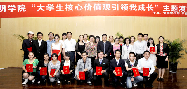 比赛在严肃而热烈的气氛中紧张有序的进行着,来自19个院系的19名选手经过激烈的角逐,人文学院的方璟、社会管理学院的金英华获得了比赛一等奖,他们将代表我校参加云南省“当代大学生核心价值观引领我成长”主题演讲比赛。党委副书记孙勇、党委副书记纪委书记李媛芬分别为一等奖、二等奖获得者颁奖。