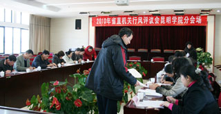 12月27日下午,受省直机关工委委托,国家统计局云南调查总队一行到我院开展群众评议省直机关行风建设活动,评议会在我院办公楼502会议室举行。