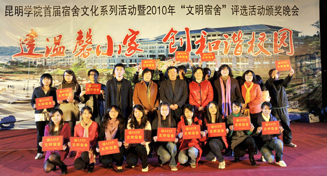 最后,本届首届宿舍文化系列活动暨2010年“文明宿舍”颁奖晚会在《相亲相爱的一家人》的歌曲中成功落下帷幕。孙副书记、李副书记、熊副院长对本次晚会的举办给予了高度评价,并与获奖宿舍及个人上台合影留念。整台晚会气氛热烈,它的成功举办为beat365在线体育唯一正版首届宿舍文化系列活动暨2010年“文明宿舍”评比活动画上了一个圆满的句号。