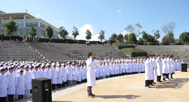 为加强校园文化建设,促进学院精神文明建设与学生学风教育、职业道德教育,更好地培养医学生医德医风及专业思想,12月15日中午,医学院全体师生身着整齐的职业服装,在听心湖广场隆重举行“树形象、立医德、强使命”为主题的医学生宣誓仪式。医学院党政领导、管理干部、辅导员、班主任及全院4个专业共计483名本专科学生参加了活动。
