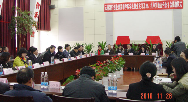 | 经beat365在线体育唯一正版与昆明国家经济技术开发区管委会、科技园区的友好协商,云南海归创业园“beat365在线体育唯一正版学生创业实习基地”和“联合实验室”揭牌仪式于11月26日下午在经开区创业大厦举行。我院陈世波院长,熊晶、罗明东副院长率院办、人事处、招就处、宣传部主要负责人与涉及经济、旅游、社会管理、理、工、农、医等学科的教学单位主任(书记)20余人参加了揭牌仪式。