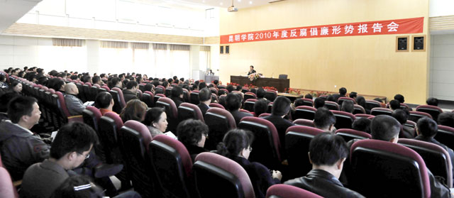 报告会邀请中共昆明市委常委、纪委书记应永生同志作“反腐倡廉形势报告”。应书记根据《廉政准则》、《关于加强高等院校反腐倡廉建设的意见》和《直属高校党员领导干部廉政自律十不准》,结合昆明市实际情况,从三个方面作了讲解:第一,必须坚决查处违背准则的严重违纪违法行为。他详细分析了昆明市2010年发生的“8.7”、“8.17”、“8.27”反腐专案,充分体现了省委省政府、市委市政府坚决惩治腐败的鲜明态度和坚定决心。第二,淡忘准则必然私欲膨胀坠入深渊。应书记指出了常见的干部需要特别注意的五种情况:(1)理想信念动摇,(2)不受制度约束,(3)缺乏有效监督,(4)难抵糖弹诱惑,(5)私欲膨胀自毁。第三,严格要求遵《守准》则才是真正爱护干部。应书记告诫各级组织和干部:一要深入开展反腐倡廉教育,二要加强对权力的制约和监督,三要大力推进工程建设领域制度创新,四要继续支持、加大查处违反准则的类型案件的力度。