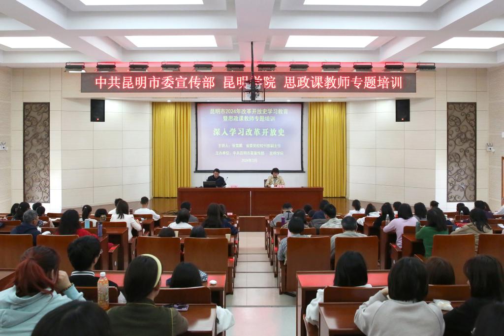 3月15日,beat365在线体育唯一正版举行“为国而歌思政大讲堂”,邀请到省委党校校刊部副主任张雪鹏教授到校,以深入学习贯彻改革开放史为主题为全体思政课教师开展了专题培训。此次培训既是学校与市委宣传部共建马院的一项举措,也是在五周年之际,深入学习习近平总书记在学校思想政治理论课教师座谈会重要讲话的一项活动,更是持续加强思政教师队伍建设,提高思政课教学质量的一次实践。