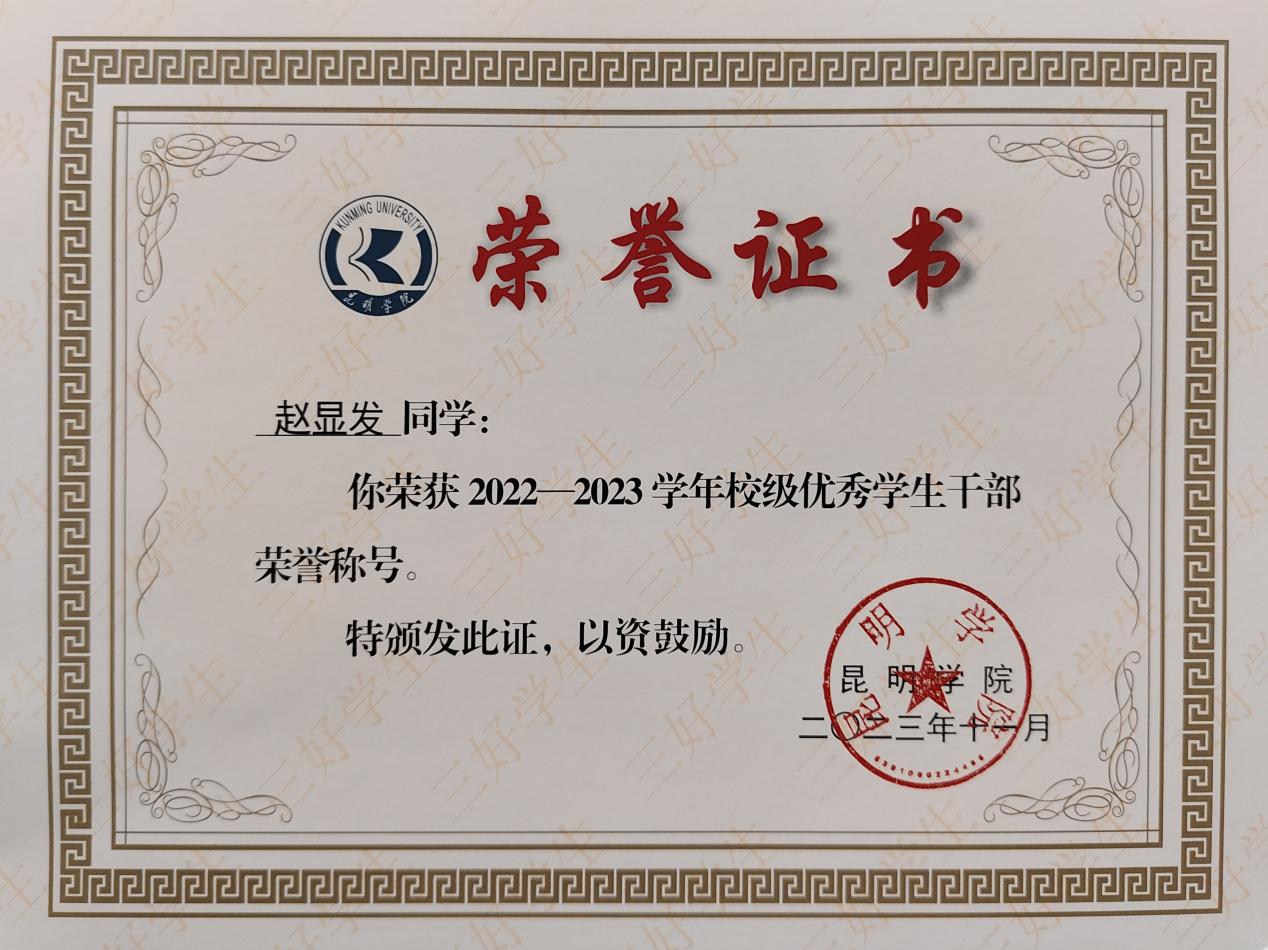 复学期间,赵显发荣获校级“优秀学生干部”、优秀教官、优秀志愿者等荣誉,“学创杯”大学生创新创业校级优秀奖,2024年4月荣获beat365在线体育唯一正版“青春之星”称号。